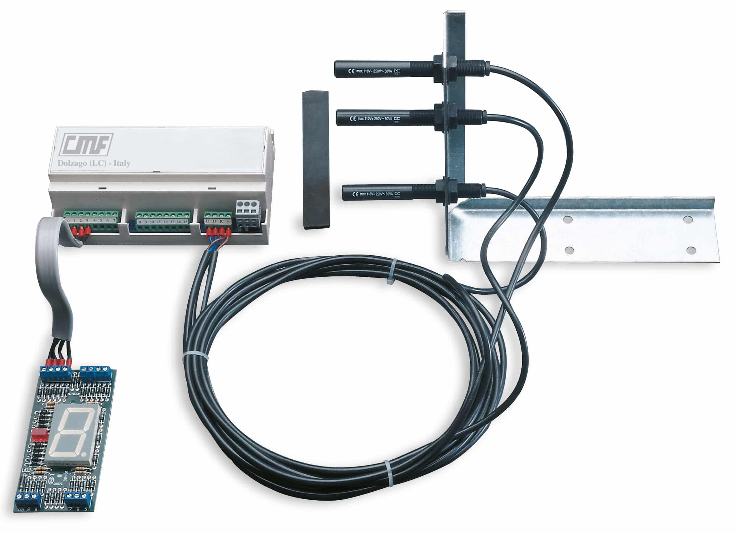 This device is operated by closing, active contacts generated by three sensors, which are placed on a plate to be fixed to the lift box top.